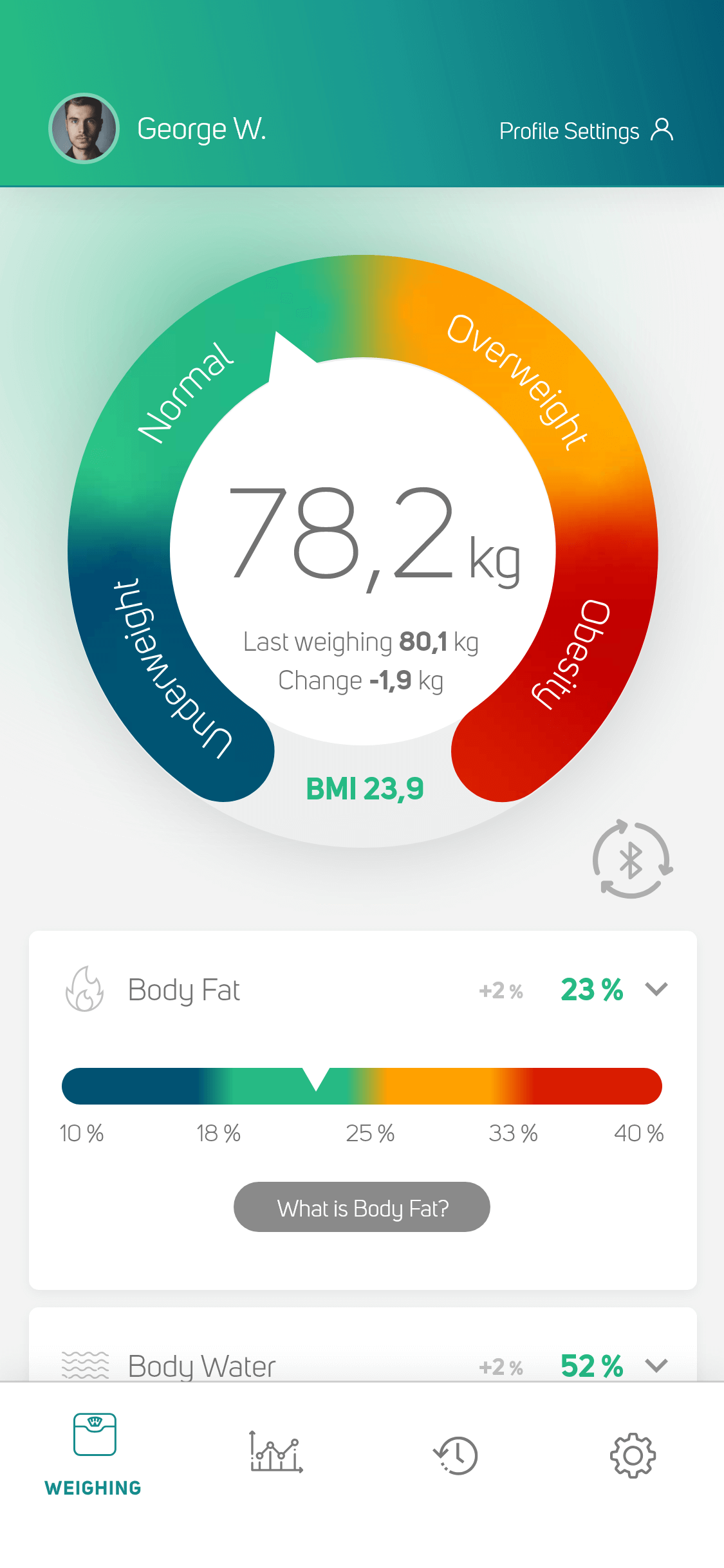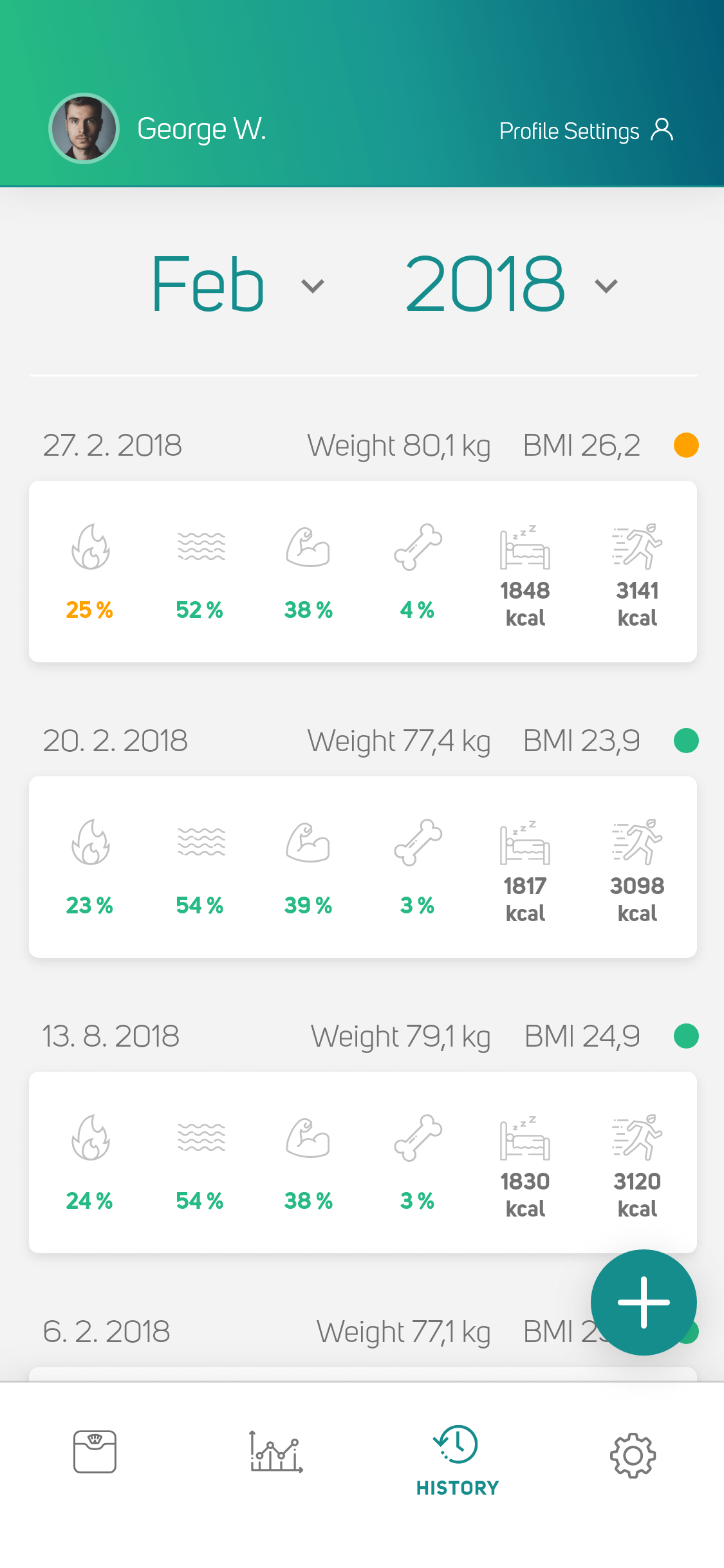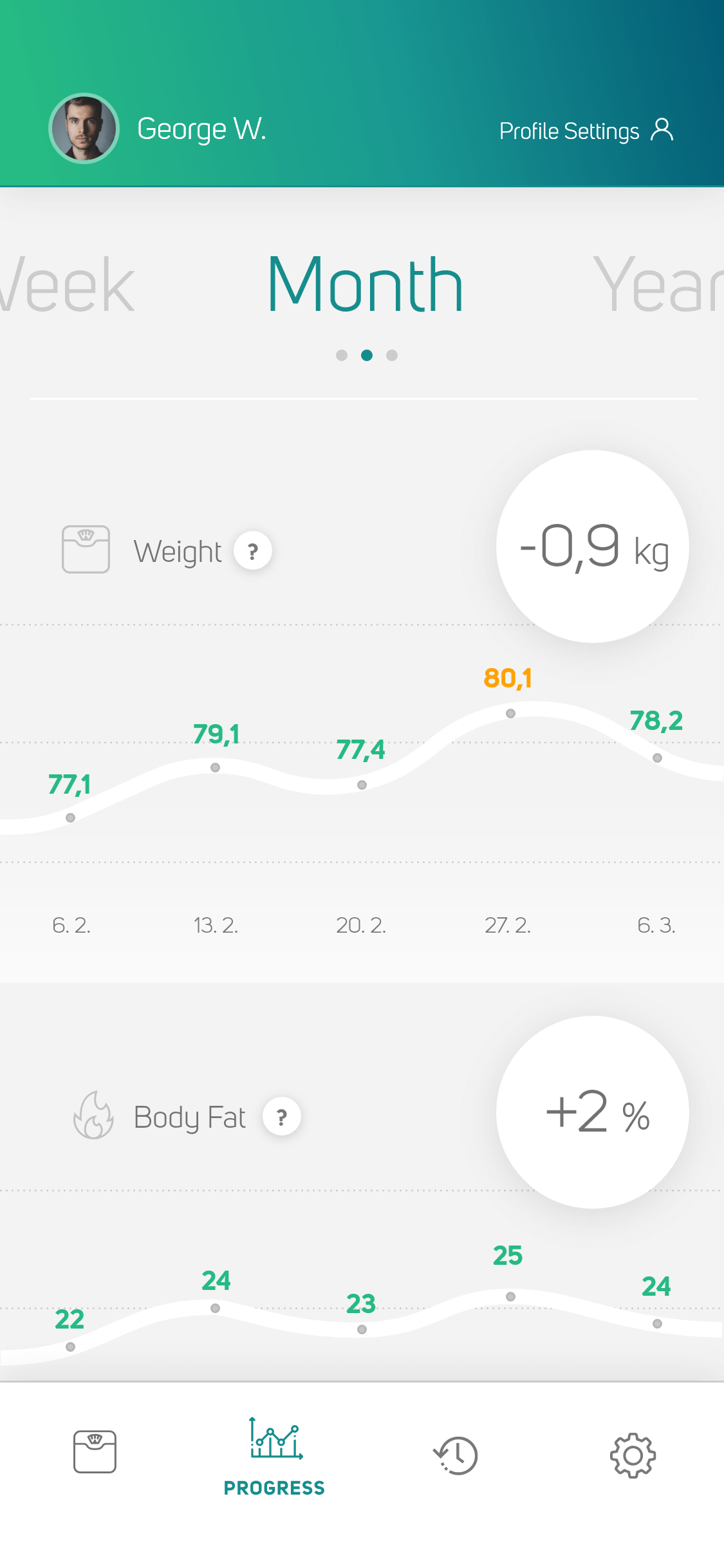 Díky přehlednému grafu uživatel vidí progres svých měření v čase a může tak porovnávat své výsledky např. vůči změnám stravování nebo fitness režimu. Na grafu jsou hodnoty znázorněny podle BMI indexu ve čtyřech barvách od modré po červenou.